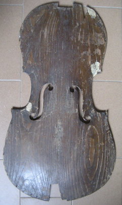 Ti voglio allora mandare anche la foto della tavola vista dall'interno, potrai notare la catena che è centrale e anomala per gli strumenti ad arco (probabilmente risponderà male sui bassi). Io non so ancora cosa farò nel restauro, ho conosciuto un esperto organologo, famoso e disponibile, e a lui chiederò consigli.